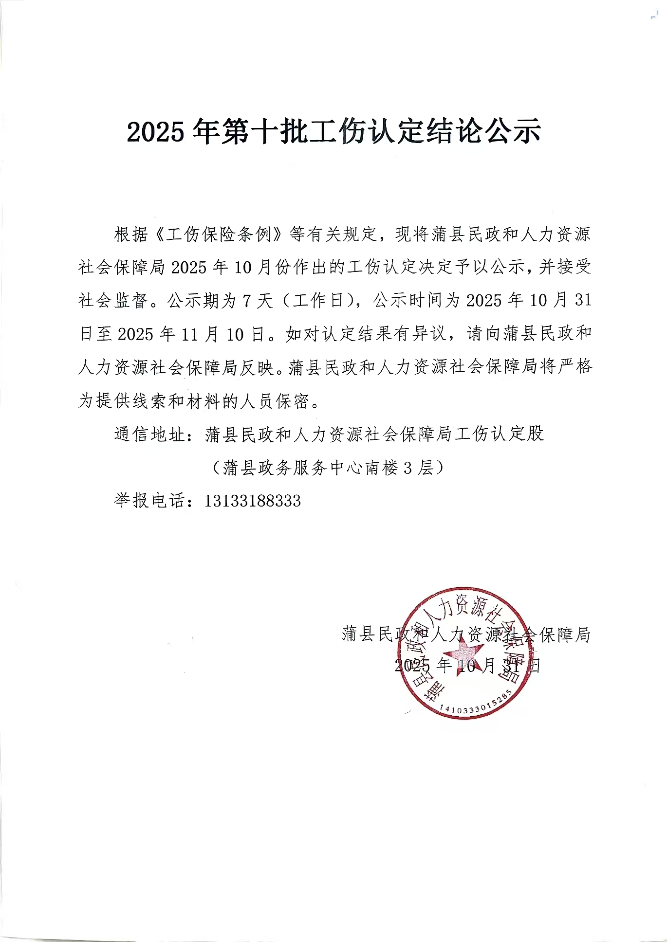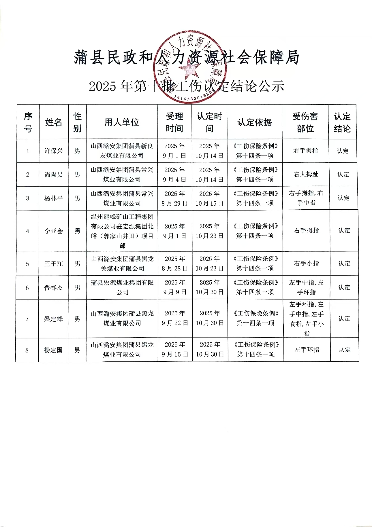 蒲县民政和人力资源社会保障局2025年第十批工伤认定结论公示