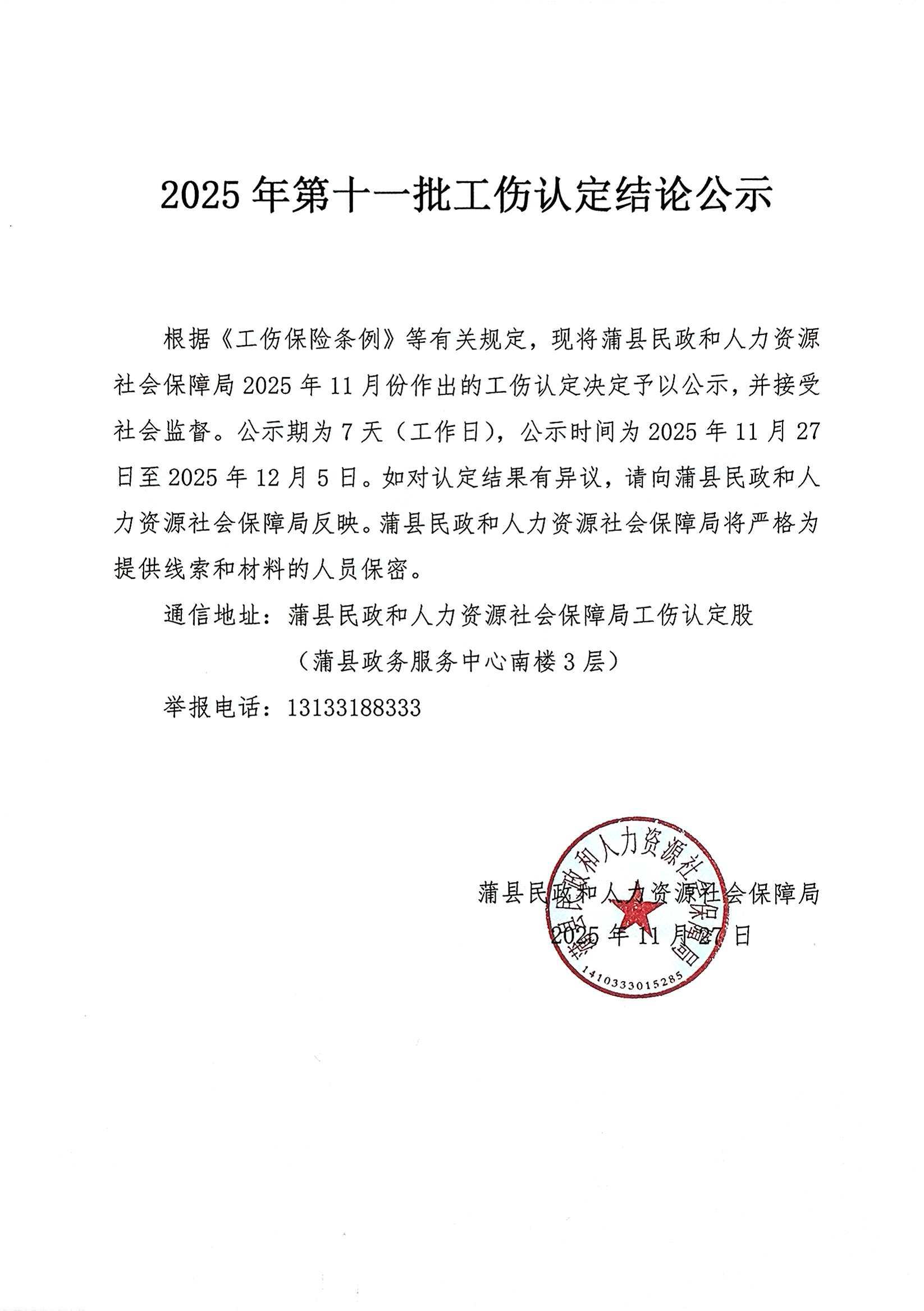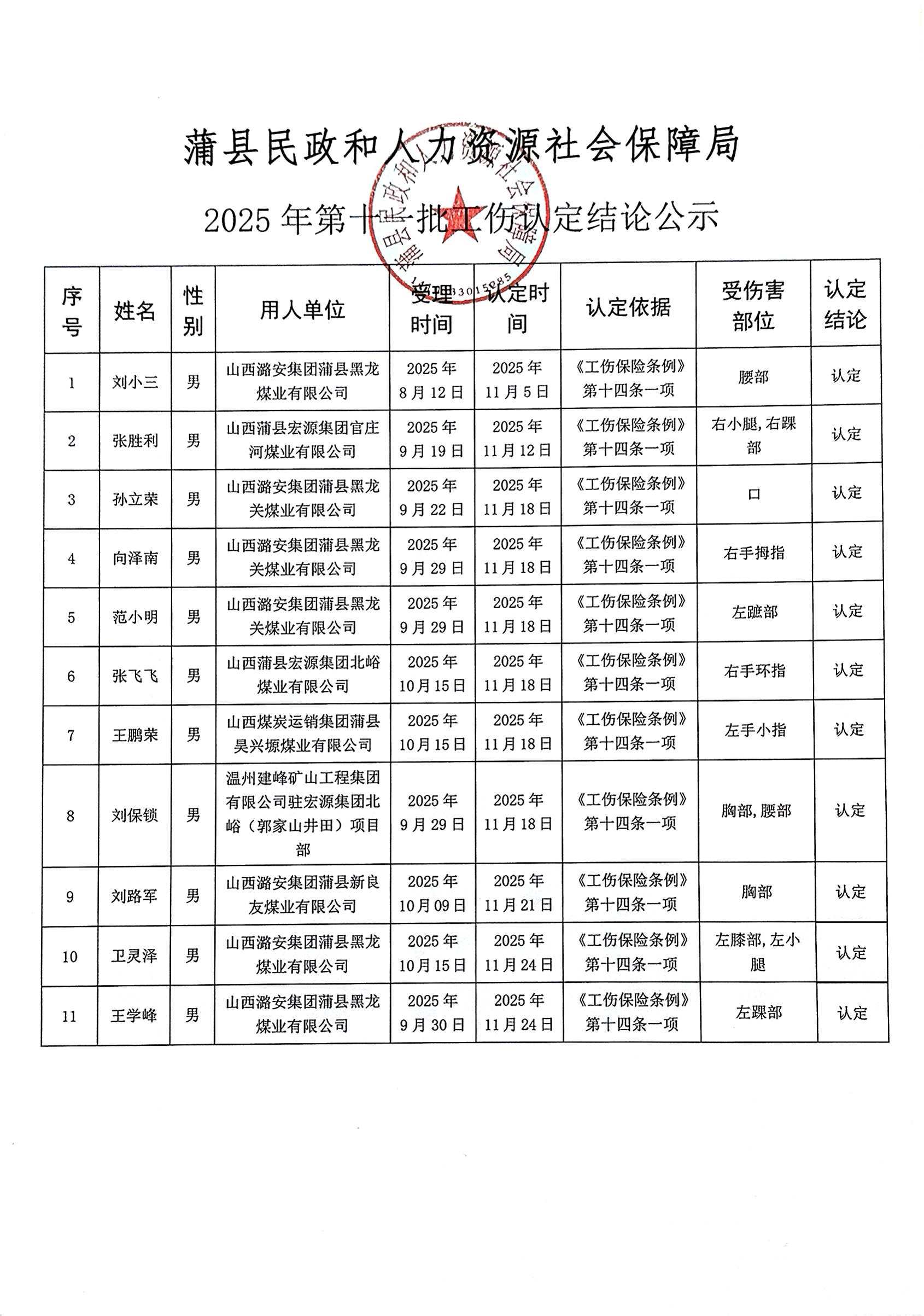 蒲县民政和人力资源社会保障局2025年第十一批工伤认定结论公示